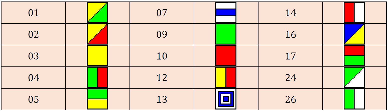 В таком случае среди комбинаций цветов в условии должны быть последовательности ‘цвет для буквы’ + красный (А) и ‘цвет для буквы’ + другой цвет (В). Они действительно есть, а предполагаемому обозначению буквы в них соответствует бледно-лунный цвет. Тогда синий должен обозначать 3 (порядковый номер буквы В в алфавите, также встречается в номере маршрута 23), а для обозначения цифры 5 остаётся оливковый.