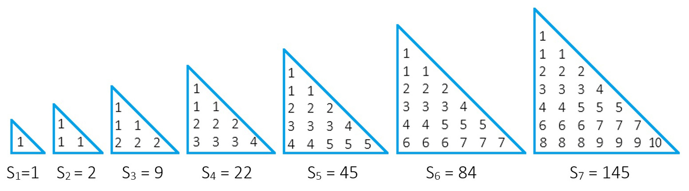 Можно рассмотреть множества чисел в числовых треугольниках, размеры которых с каждым шагом увеличиваются за счет добавления очередной строки. Их суммы тоже образуют новую последовательность (рис. 2): 1, 3, 9, 22, 45, 84, 145, 234, 360, 532, 759, 1053, 1426, 1890, 2460, 3151, 3978, 4959, ... Эта последовательность фактически является последовательностью частичных сумм последовательности, возникшей при решении нашей задачи. Эту последовательность тоже можно считать новой, она отсутствует в базе OEIS.