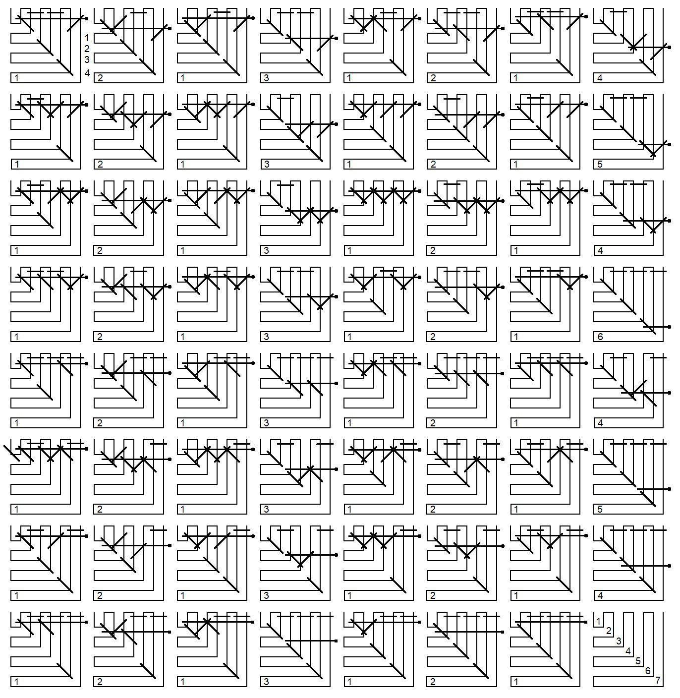 На рис. 5 показано самое короткое решение в 63 хода. Для каждого хода указан номер зоны, в которую нужно перевести челнок. Номера этих зон указаны в левом нижнем углу соответствующей схемы состояния змейки, на которой также показано положение челнока и всех колец.