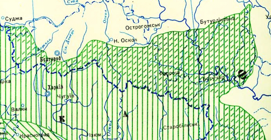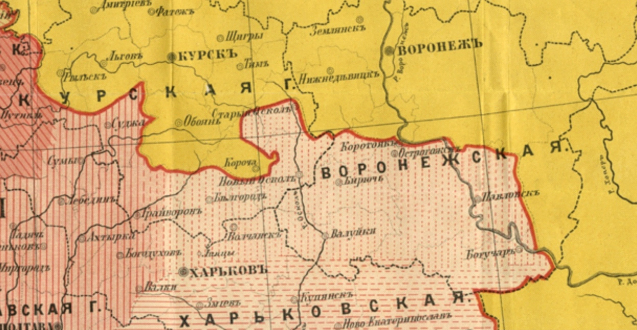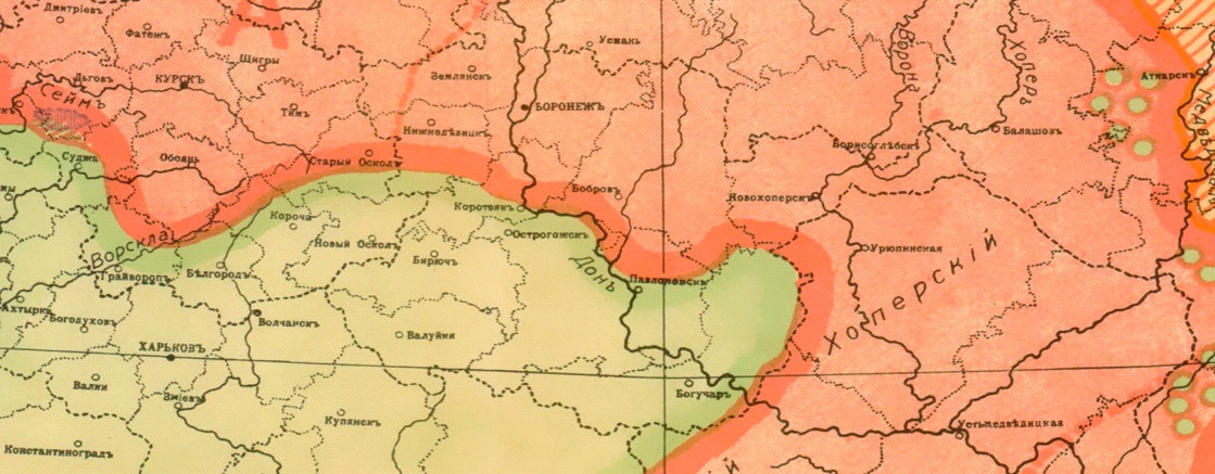 Примерная граница распространения украинских говоров на территориях нынешних Курской, Белгородской и Воронежской областей показана на самых старых диалектологических картах 1871 г. и 1914 г.: см. фрагменты этих карт, включающие территорию современной Воронежской области, ниже на рисунках 1 и 2. Впоследствии примерно по этой же линии прошла граница населенных пунктов, обследованных для Атласа украинского языка (АУМ).