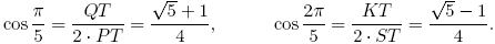Теперь легко найти разные элементы. Так, для нас будет иметь значение, что длина диагонали правильного пятиугольника со стороной 1 есть . Другой важный момент — значения тригонометрических функций в точках π/5 и 2π/5. Например,