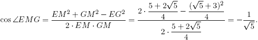 Вернёмся к двугранному углу додекаэдра. Как следует из теоремы косинусов для треугольника EMG, EG2 = EM2 + GM2 – 2 · EM · GM · EMG