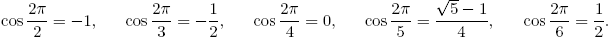 Теперь мы можем заняться анализом полученных результатов. Как мы уже говорили в самом начале, для того, чтобы копиями некоторого платонова тела можно было заполнить всё пространство без остатка, необходимо, чтобы двугранный угол этого платонова тела имел вид 2π/n. Значения косинусов углов такого вида, соответствующие значениям n = 2, 3, 4, 5, 6, таковы: