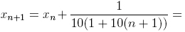 Теперь всё-таки посчитаем, что же происходит в нашей задаче. Будем фиксировать положение черепахи на ленте каждую секунду. (Можно считать, что раз в секунду Ахиллес сдвигается на 10 метров, удлиняя ленту, а черепаха вслед за этим проползает свои 10 сантиметров. Такое допущение не изменяет сути происходящего — мы как будто наблюдаем за процессом по фотографиям, сделанным через секундные промежутки времени.) Пусть через n секунд после начала движения черепаха уже продвинулась на xn (напомним, что мы меряем её прогресс в долях от 1 — полной длины ленты; в самом начале x0 = 0). Как изменится её положение через секунду? Сначала лента растянется на 10 метров и её длина составит 1 + 10(n + 1) метров. При этом доля пройденного черепахой пути не изменится, ведь она тоже двигается, пока растягивается лента. После этого черепаха проползет свои 10 сантиметров, что составляет