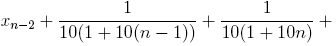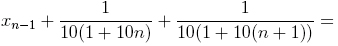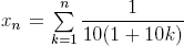 . Нам нужно выяснить, может ли эта сумма при больших n перевалить через 1, и если может, то приблизительно при каком n это произойдёт. Прежде чем читать дальше, проверьте свою интуицию: сможет при каком-нибудь n xn быть больше 1? (Первое слагаемое в сумме равно 1/110, второе равно 1/210 и т. д.)