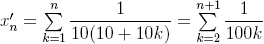 . Естественно, вся сумма при этом уменьшается. Но если про эту новую сумму получится выяснить, что она при каком-то n окажется больше 1, то и исходная тоже будет больше 1 при этих n. Поэтому исследуем x'n. Перепишем эту сумму ещё раз, отбросив последнее слагаемое (это её еще немного уменьшит):