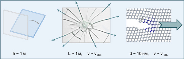 Смотрите, как это получается. Трещина возникает и распространяется потому, что в месте контакта стекла и пола возникают напряжения, и в какой-то момент молекулы вещества расходятся под нагрузкой. Поделив размер стекла (1 метр) на скорость движения трещины, можно получить характерное время разбивания стекла. Но какую скорость надо подставить?