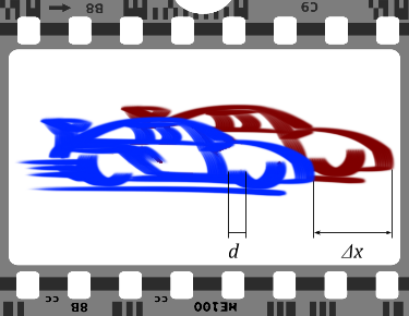 Предположим, вы выставили на фотоаппарате выдержку t = 1/250 секунды (т. е. 4 миллисекунды) и получили картинку, показанную на рисунке. Зная параметры машин, вы оцениваете расстояние, на которое одна машина опережает другую, в Δx = 90 см. Изображение машин слегка смазано, и эту пространственную размазку вы оцениваете в d = 24 см. По формуле равномерного движения d = u·t вы находите скорость машины: u = 60 м/с = 216 км/ч, а затем и опережение по времени: