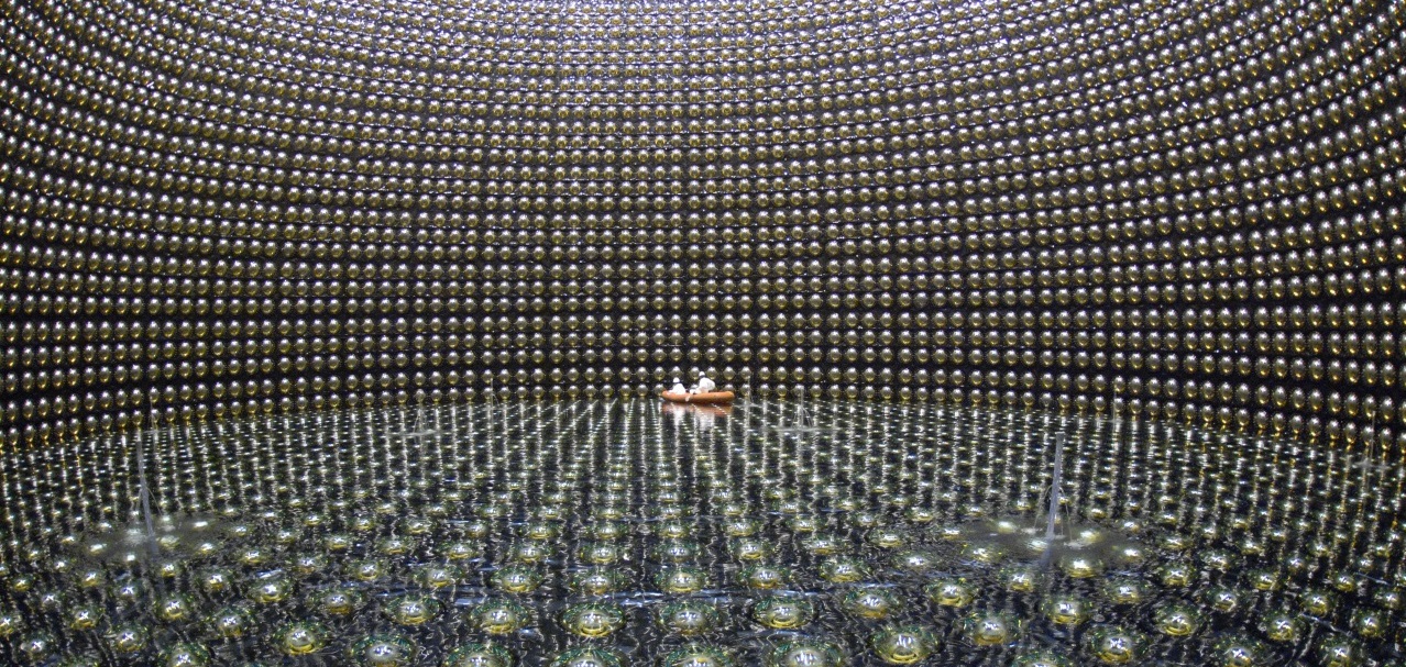 Внутренность японского детектора Super-Kamikande: огромный бак со сверхчистой водой и тысячи фотоумножителей, установленные на стенках для регистрации редчайших событий превращения элементарных частиц. Изначально он строился для поиска распада протонов, но его основное направление работы сейчас — изучение нейтрино